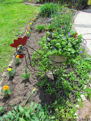 He bought a potted plant for the rooster planter too. The grass looks like feathers. I got all the marigolds planted, but need to weed the back portions of all the flower beds yet. We did weed and plant some in the mailbox garden as well.