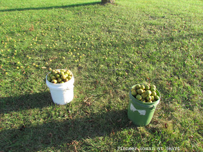I took some time to pick up two five gallon buckets of our black walnuts. They have pretty much fallen in the last few days here. In fact, they were falling on me as I picked them up. Black walnuts contain more protein than English walnuts and have a stronger flavor.