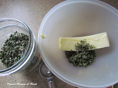 I mixed 2 Tbsp. of dried thyme (crushing as I added), and 1 stick of butter, plus about 1 Tbsp. or organic/non-gmo olive oil (making it a bit more spreadable).  I use a hand mixer to mix this.  I also do not roll it up and wrap it and refrigerate it.  It will be gone quickly.  I put it in a glass jar.
