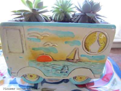Remember this camper van planter I picked up at an antique store months ago? It really doesn't match anything, but it now has a few succulent plants in it. I just love my new plants.