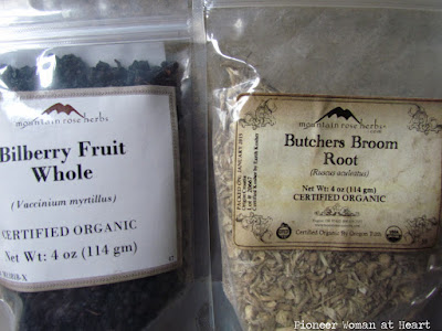 My "eye health" tea ran out, so I took time yesterday to mix up some butcher's broom and dried bilberries.  I just add freshly grated ginger when I brew it.  Bilberries are sometimes difficult to get, but I can tell you 4 ounces is equal to 1 cup.  And they are somewhat expensive when purchased organic (but worth it).