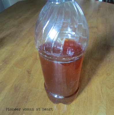 This is the jewelweed solution prepared by an acquaintance. She simply boiled it in water, strained it and cooled it. She gifted it to us in an old soda bottle.