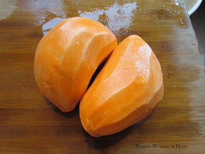 This is not your regular chili. To get this pot of awesome delicious-ness going, I went into my "pretend root cellar" and got a few sweet potatoes (so thankful we still have some, and in edible condition).